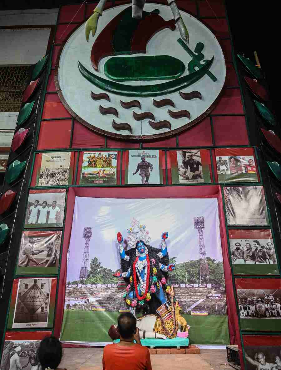 Maa Kali takes centre stage against a Mohun Bagan-inspired backdrop. Faith meets football as the pandal honours the club’s legacy with pride.
