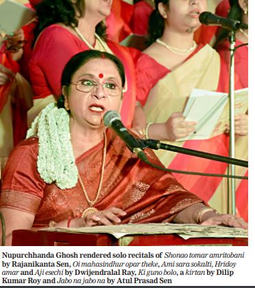 On the eve of Poila Baisakh, The Bengal Club organised Jugantokari Teen Kobi, an evening of music in association with The Telegraph, to welcome the Bengali New Year. The programme was presented by Dimension 4 and featured popular devotional and patriotic compositions by three legendary Bengali poet-lyricists — Dwijendralal Ray, Rajanikanta Sen and Atul Prasad Sen. The stirring and soulful melodies were performed by eminent singer Nupurchhanda Ghosh and her students in the form of solo and chorus performances. Artist Babita Das expressed the mood and melody of the evening with a vibrant painting on her canvas, done live before the audience. The programme was anchored by the co-chairperson of the Bengal Club entertainment committee, Sumit Ray. The concept and design was by Tinku Das. Glimpses.