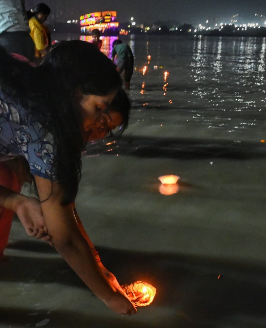 The ghat was transformed into a sight to behold as priests performed the Ganga Aarti. The echo of mantras and chants filled the air and volunteers lined the steps with rows of earthen lamps that reflected on the still water of Hooghly.