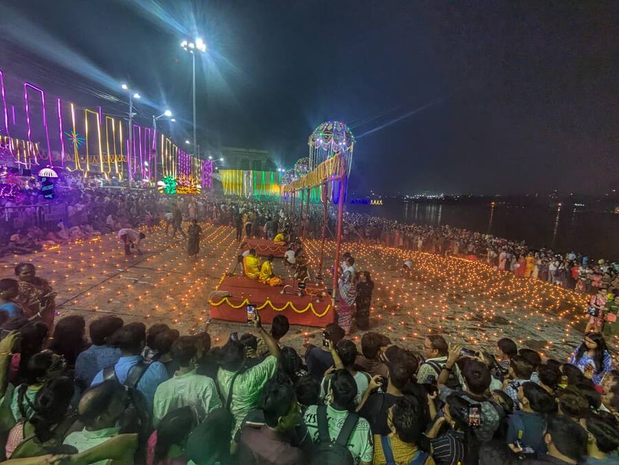 The banks of the Hooghly shimmered in golden light on Tuesday evening as thousands gathered at Baje Kadamtala Ghat, near Babughat, to celebrate Dev Deepavali.