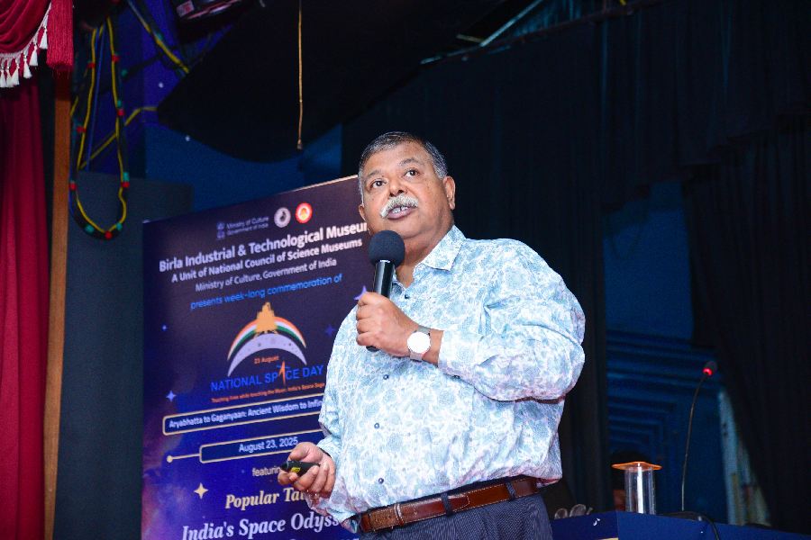 On the occasion of National Science Day, Dr Debiprosad Duari cuts the ribbon to open the exhibition From Ancient Skies to Modern Horizons, joined by Arnab Chatterjee, director, Birla Industrial and Technological Museum (BITM) and eager school children.