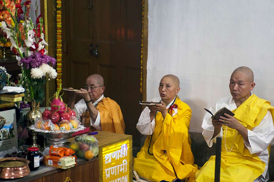 Presently, the temple celebrates its birthday on the nearest Sunday to February 16. So, it normally coincides with the second or third Sunday of February. This provides the opportunity of large participation, which goes beyond the religious connect (prayer ceremony by monks in picture). This year, the temple celebrated its 90th anniversary. A Rajgir-based Japanese Buddhist monk, Okonogi, presided over the ceremony. The ceremony began at 10am and lasted for about an hour-and-a-half.