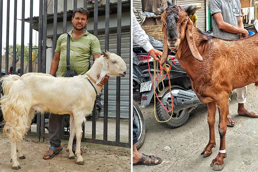 Shakib, the white goat was priced at Rs 85,000, while Salman, a brown goat was priced at Rs 90,000. Both were found at the Khidderpore goat market. Sellers informed that the more expensive goats, priced between Rs 2.5-3lakh. were already sold in the early hours of the morning