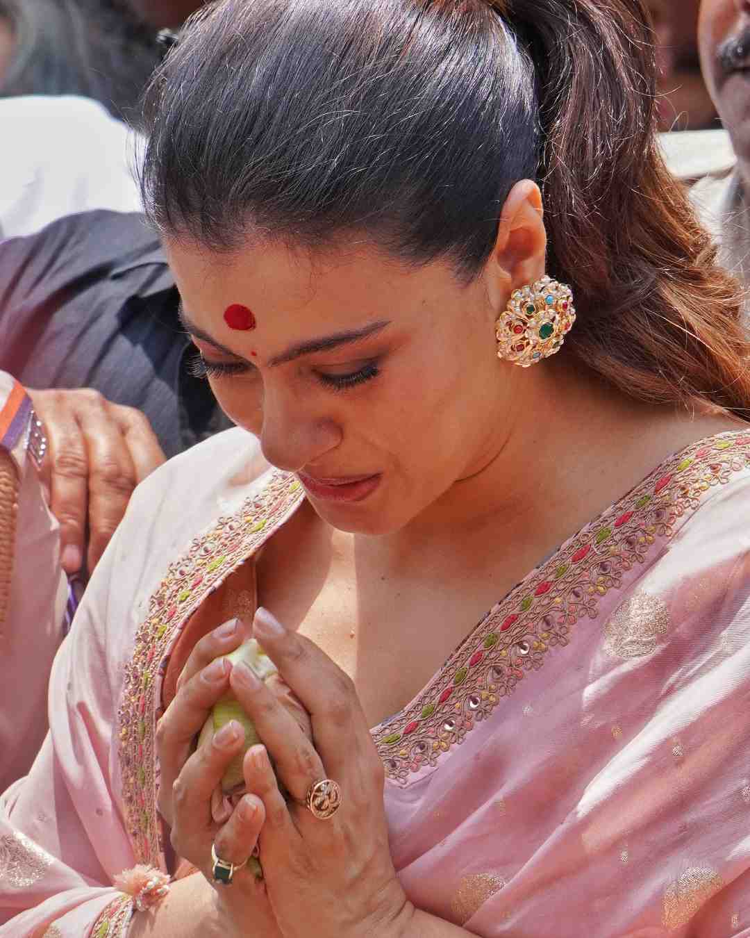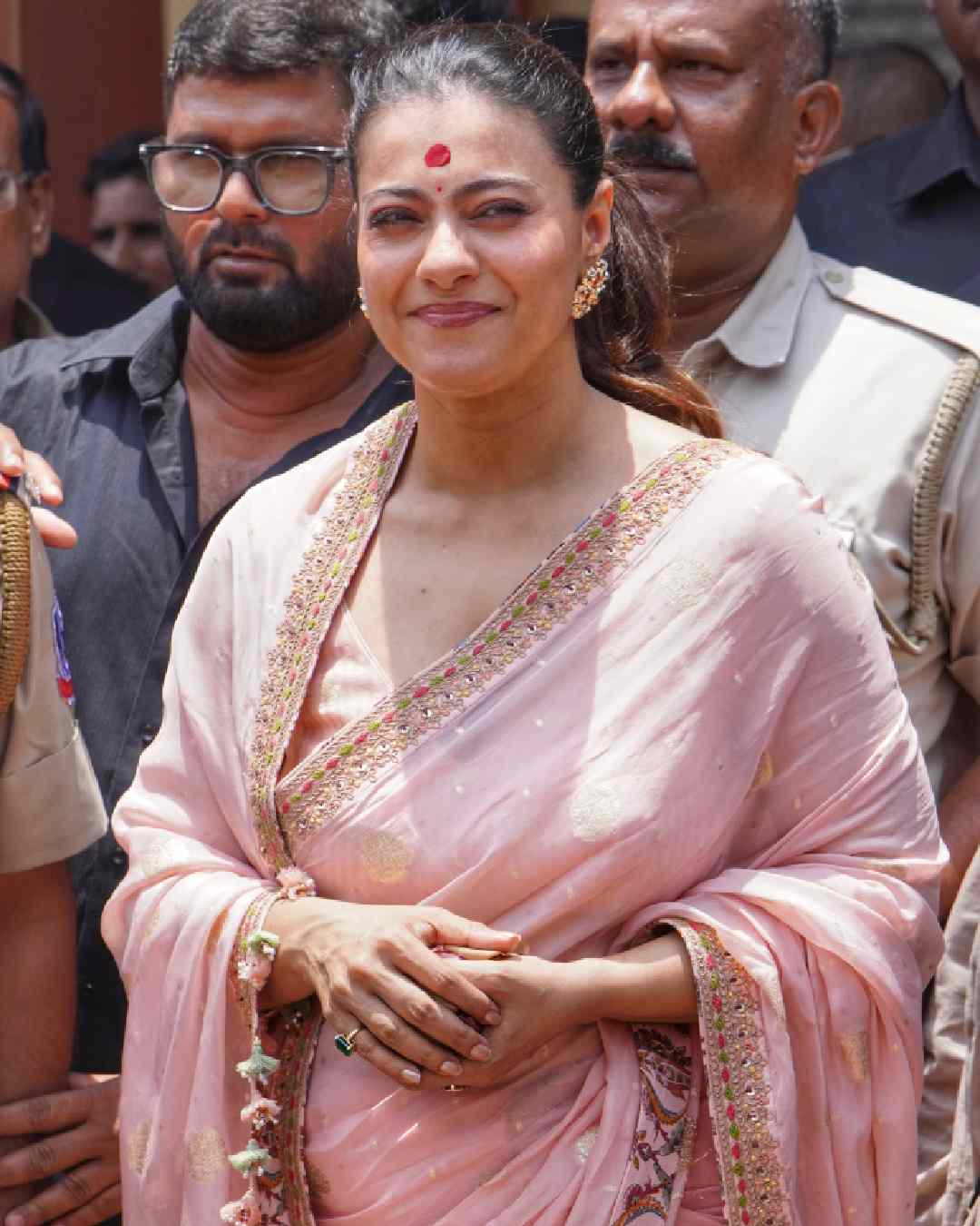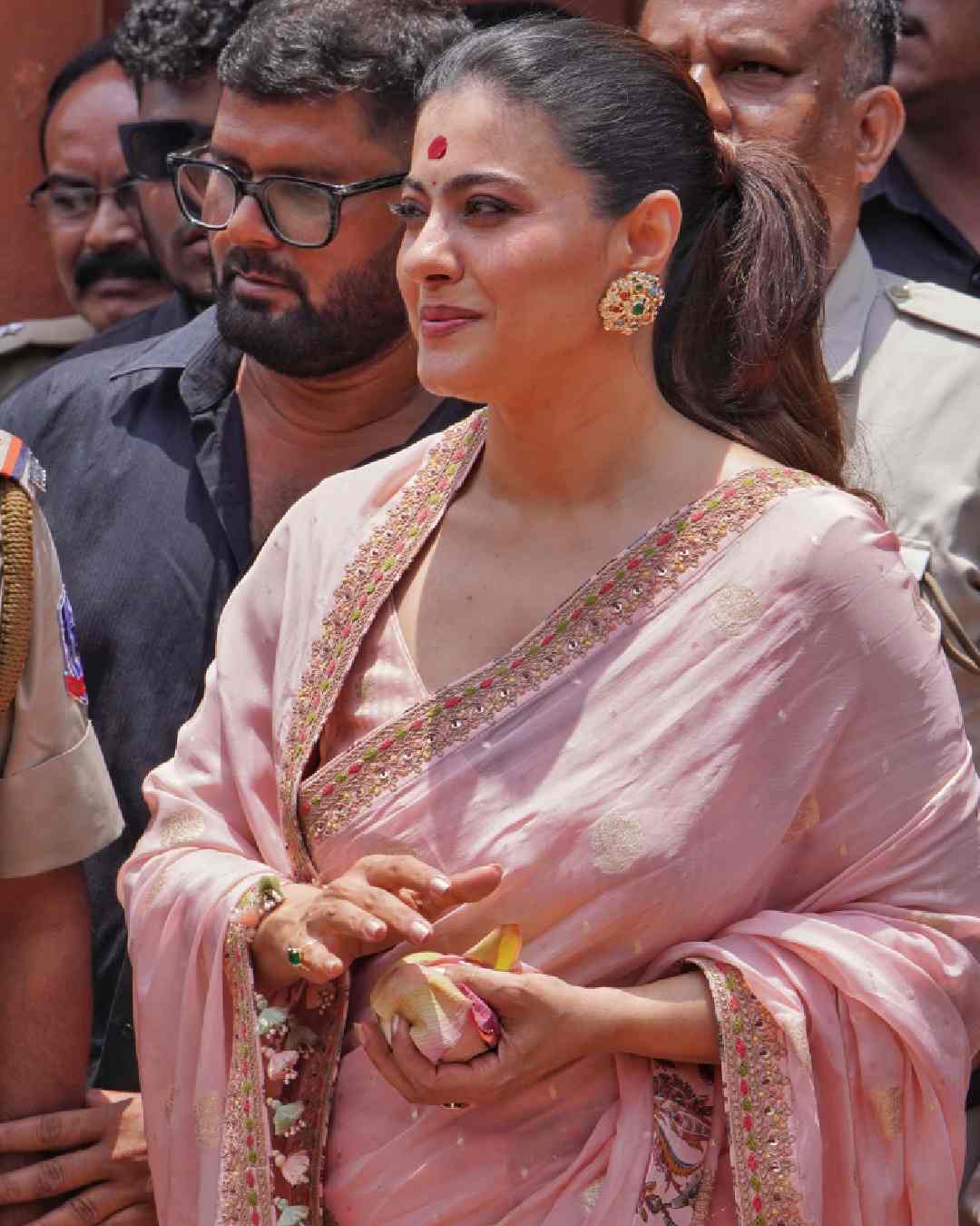 Kajol looked radiant in a blush pink sari with golden embellishments during her visit to Dakshineswar.