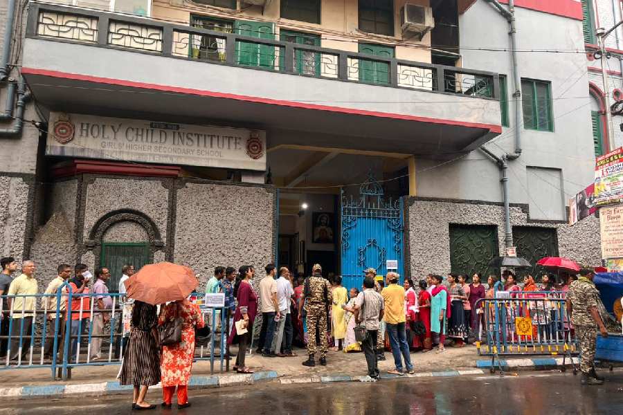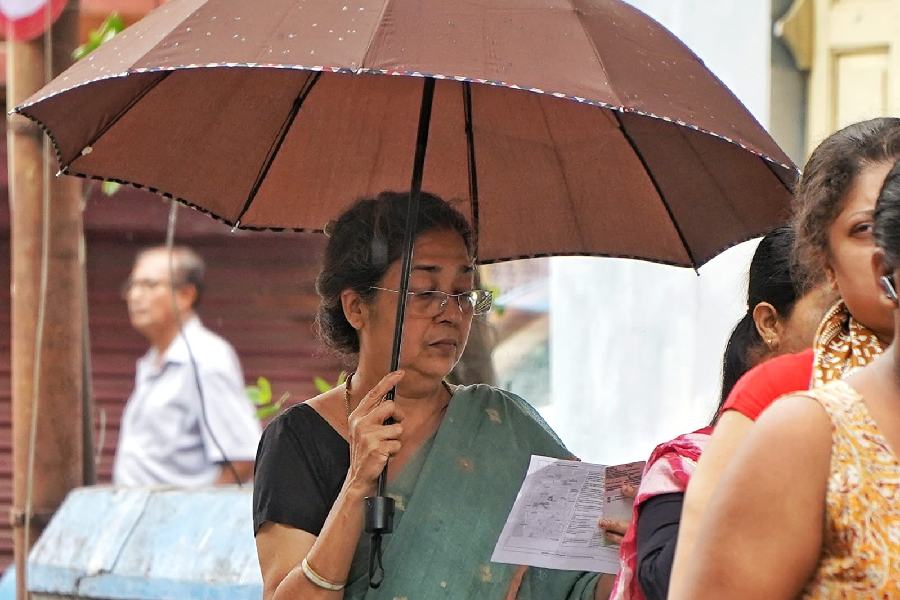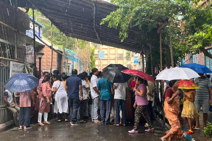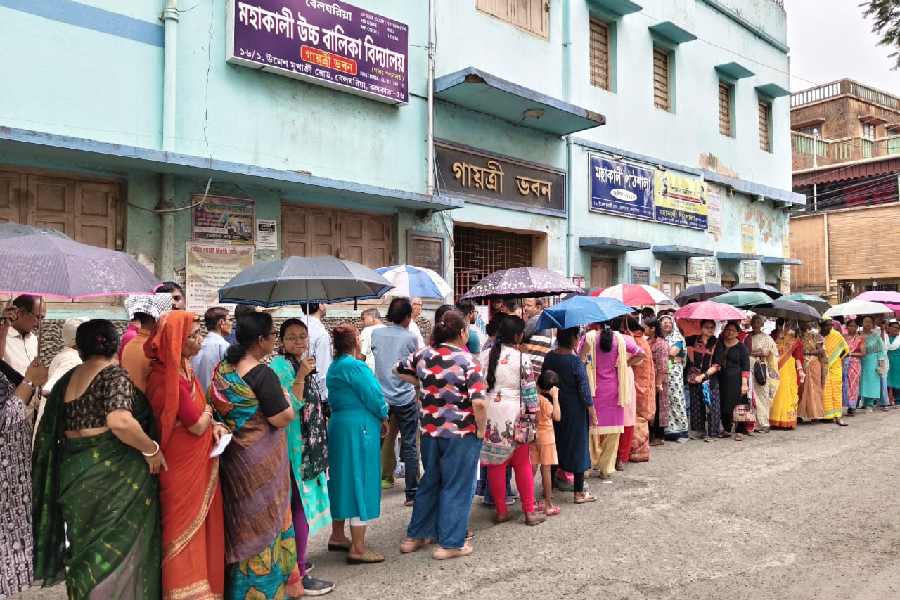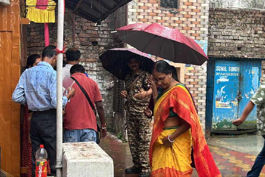 Voters at Kamarhati line up in the drizzle