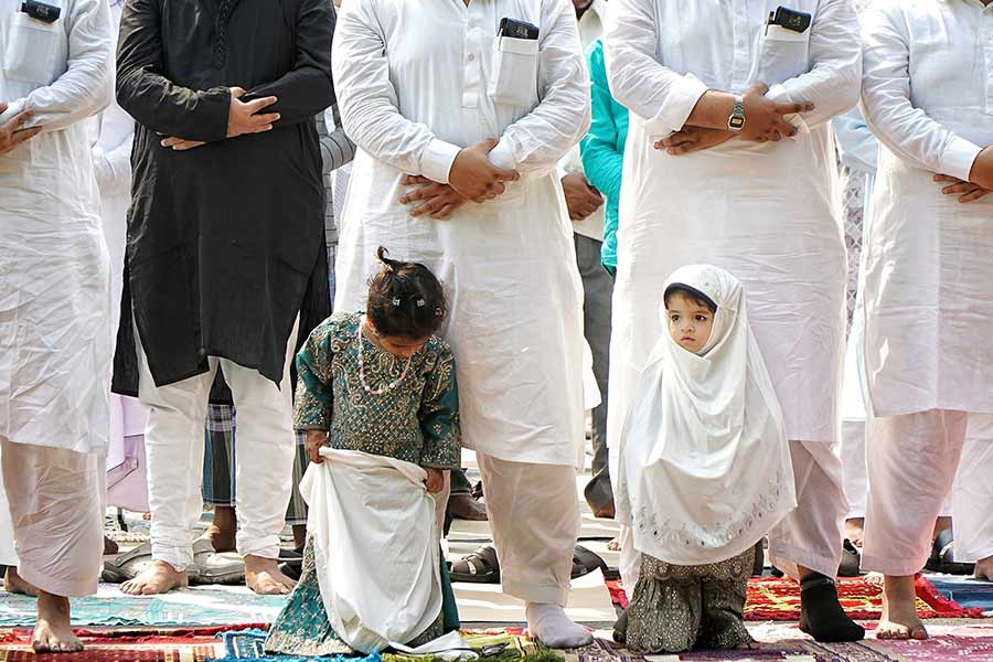 Worshippers gathered inside and outside the Nakhoda Masjid on Rabindra Sarani