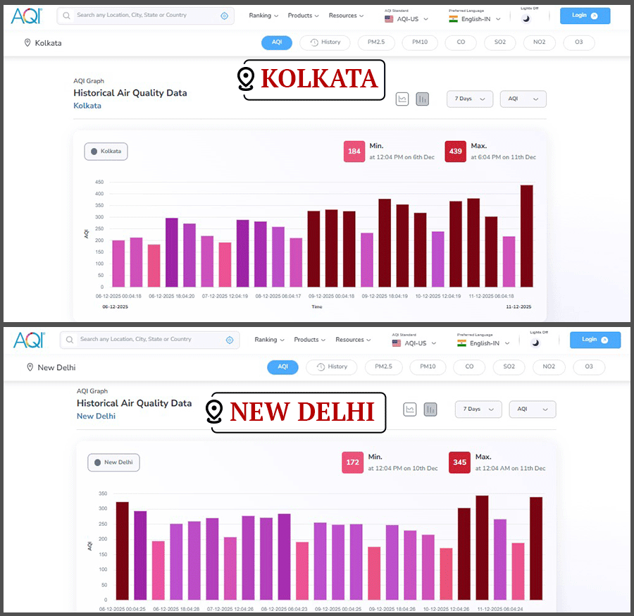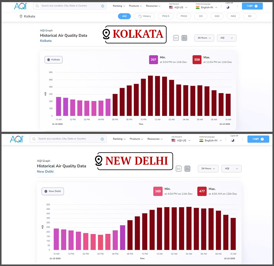Delhi, despite its long-standing reputation for toxic winter smog, recorded a lower AQI — between 172 on 10 December and 345 on 11 December. In the last 24 hours alone, Kolkata hit an even more shocking 558 AQI at 11.04 pm on 11 December, higher than Delhi’s worst reading of 477 recorded at 4.04 am on 12 December.