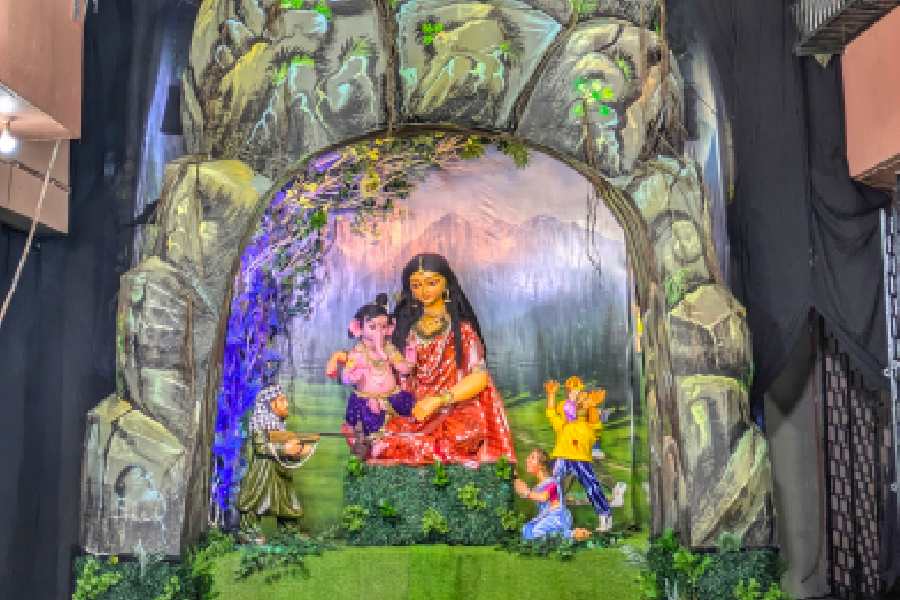 A pandal near Salt Lake PNB Crossing adopted a tribal village theme for Ganesh Chaturthi this year.