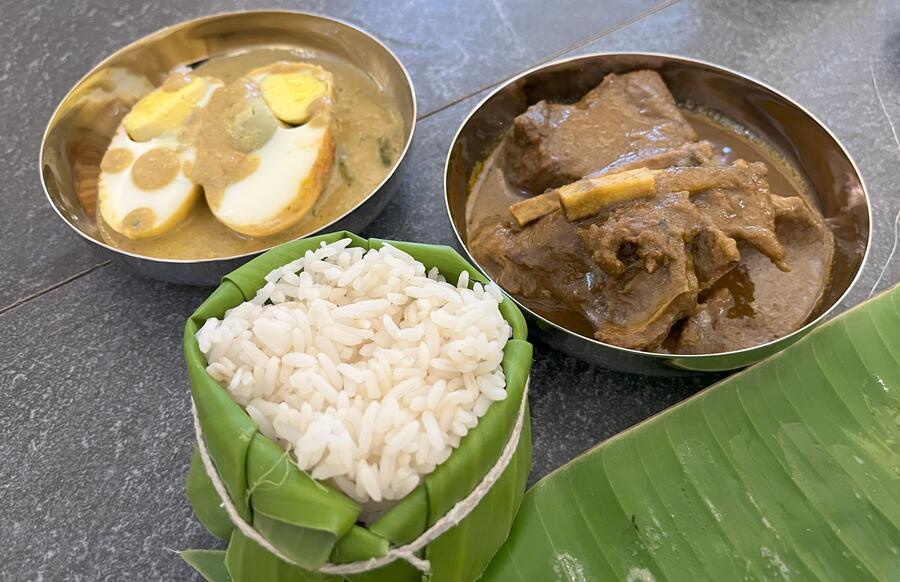 The next course had four options of non-vegetarian dishes — Campbell Hnash-er Jora Kusum-er Dim Posto, Knachkola diye Shingi Mach-er Jhol, Deshi Murgi-r Jhol with Uttorbango-r Badami Aalu or Amar Khamar's special Chui Jhal Mangsho. We opted for the egg and mutton dishes. The double yolk egg preparation is a treat for egg lovers, while the Chui Jhal Mangsho felt like a dose inducing robibarer bhat ghum. A Chui Jhal Aachar was also served on the sides.