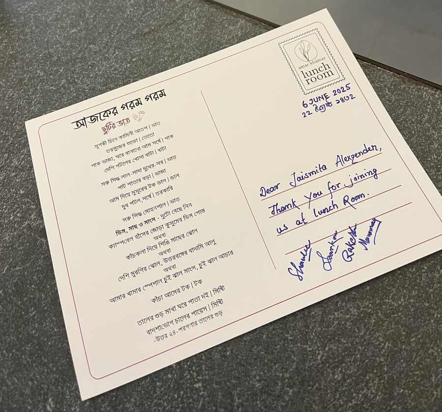 The menu card at the Lunch Room is designed to look like a postcard — a postcard that takes you back to the times of simple yet elaborate Bengali lunch on a chutir din. Moving from modern cuisine, the new menu highlights the regional, seasonal and hyperlocal ingredients of Bengal.