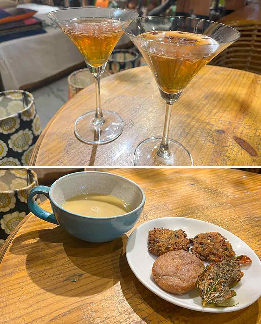 The culinary adventure began with an ode to monsoon. A steaming Kashmiri Kahwa, Tibetan Po Cha (butter tea) and Bombaiyya Irani Malai Chai were served with a platter of fritters consisting of Bihari Thekua (a rustic jaggery biscuit), Kerala’s Parippu Vada (lentil fritter) and Bengal’s Paat Patar (jute leaf fried in a batter) Bora.