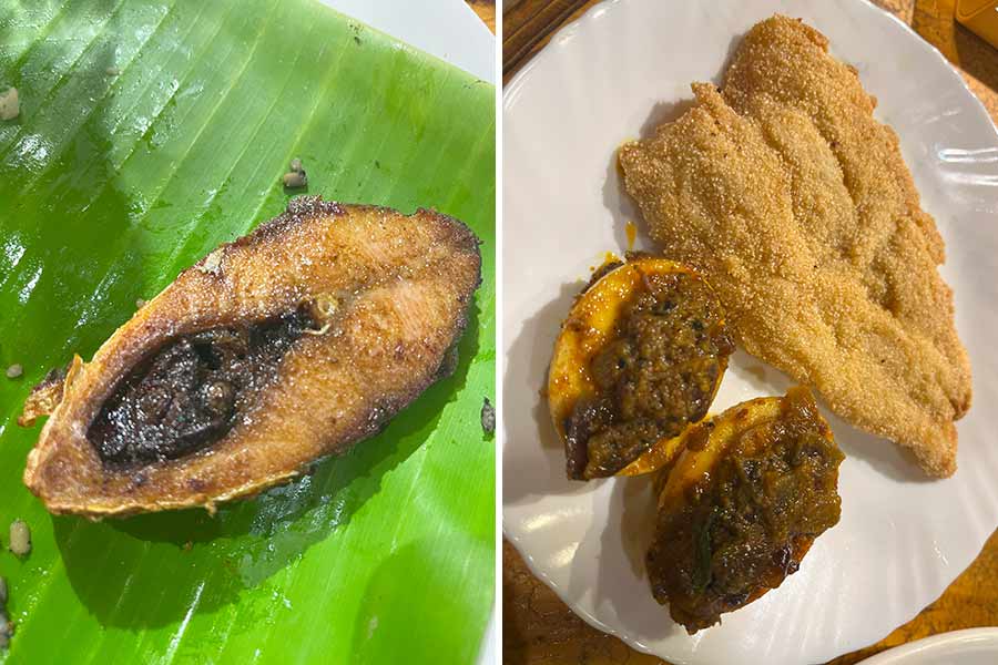 Up next, the chefs transported us to beachside shacks. A fresh Ilish peti bhaja was served alongside a crispy Maharastrian-style Bombil Rava Fry and a spicy Kaara Muttai (Tamil street-style egg masala roast).