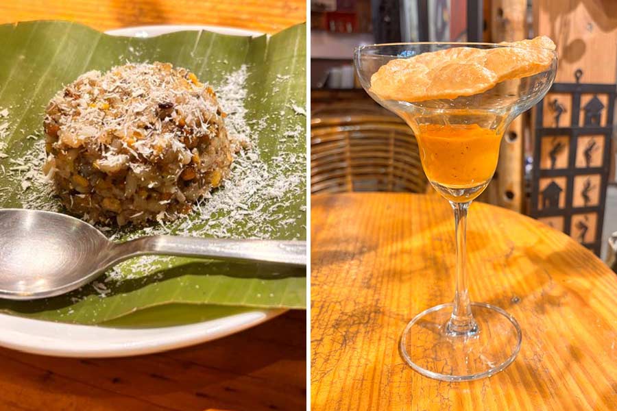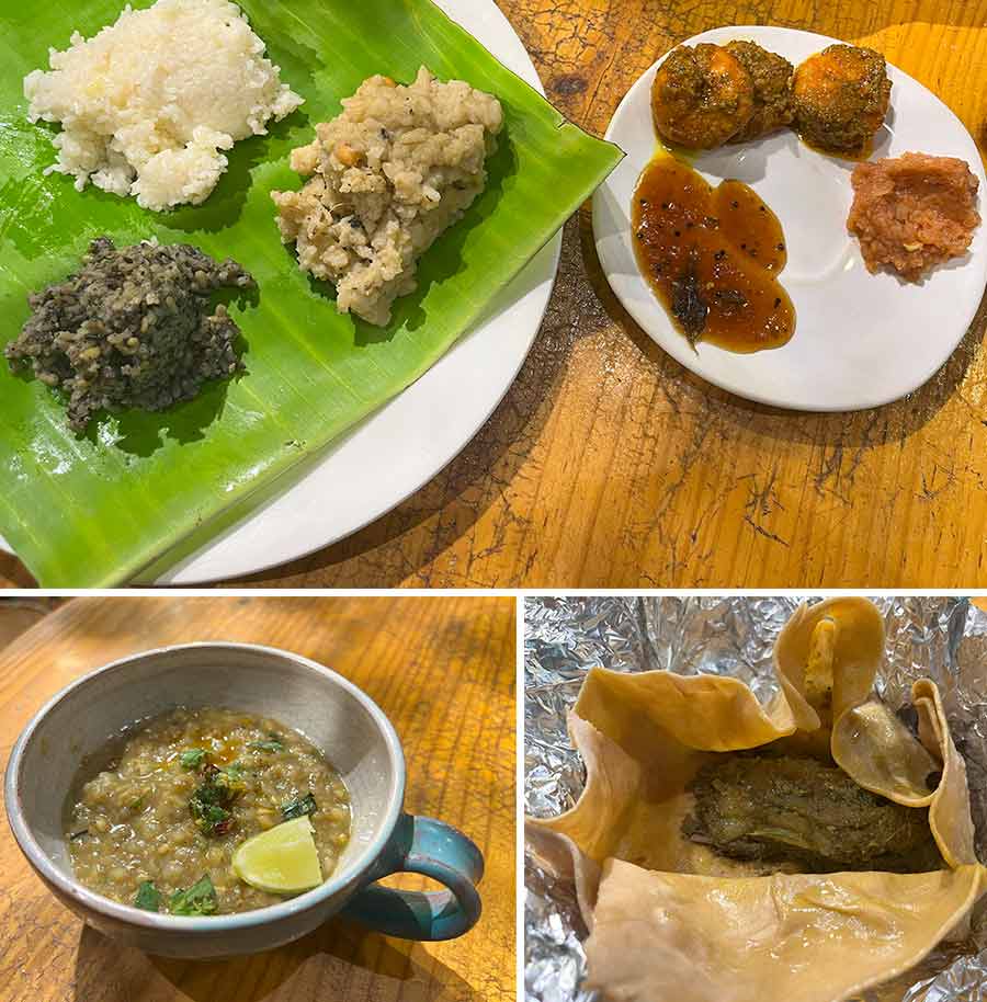 A rainy afternoon and a plate of khichuri feels like a culinary match made in heaven. The khichuri platter served had four rice preparations — a Tamil temple-style Ven Pongal, a Sikkimese Drothuk with Ilish (Buckwheat congee cooked in ilish stock), Uttarkhandi Til Khichdi and Bengal’s ultimate comfort food Makhon Bhaat (steamed gobindobhog rice with a dollop of butter). Accompaniments like Khaad Gosht (Garhwali-style mud-baked mutton), Royyala Pachadi (Andhra Prawn pickle), Injipuli (Kerala-style ginger and tamarind chutney), and Shutki Eromba (Manipuri dried fish chutney) celebrated the age-old recipes of some Indian states.