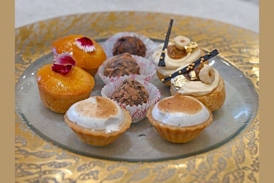 The dessert selection was a study in classic indulgence and subtle innovation. Guests sampled truffe nature, truffe caramel and truffe épicée, alongside Paris haldi and a tarte au citron de Calcutta infused with tulsi and poivre de Timut. There was also the delicately named financier Pétale d’Orient.