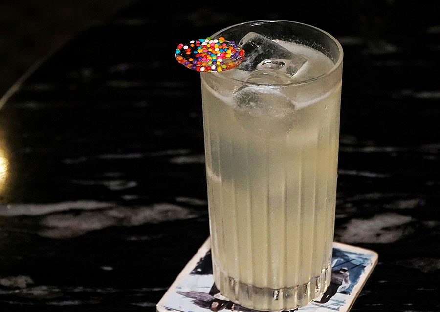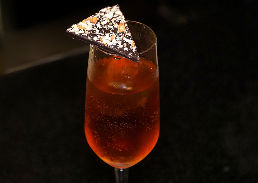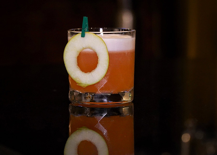 Another drink with a quirky name, Blow-Some, was floral and fresh with a playful kick. Blow-Some combines Johnnie Walker Blonde and Aperol with the delicate sweetness of sakura blossoms and the tartness of Granny Smith apples. Albumin adds a smooth, foamy body, making this a beautifully balanced cocktail that’s light yet layered. The foamy head was made with egg whites.