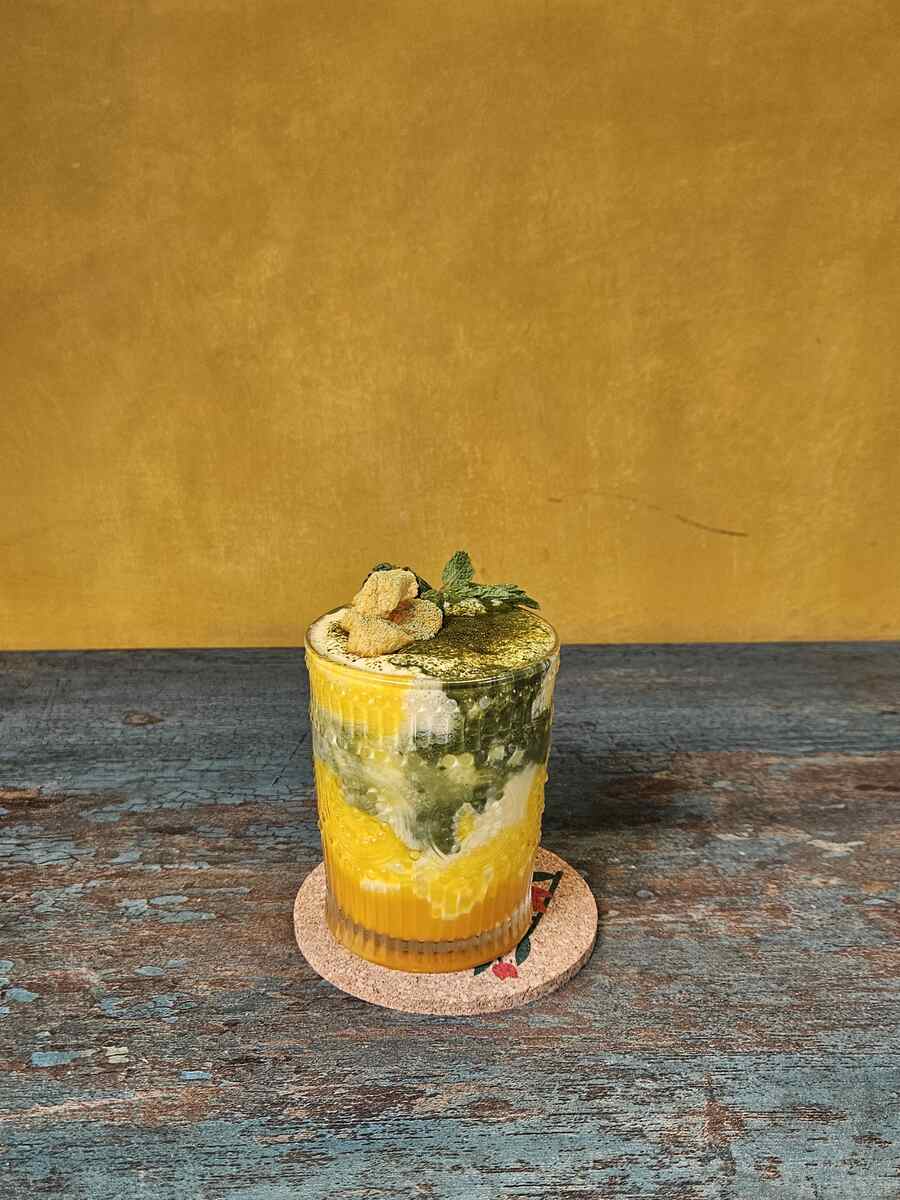 Indulge in season’s special alphonso mango puree layered with delicious vanilla matcha latte with chunks of mango and chia seed at Karma Kettle.