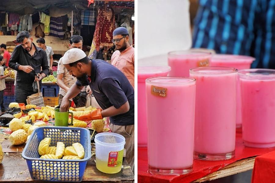 Fruits are an essential part of the Iftar meal, and juices and fresh cut fruits, along with the famous mohabbat ka sherbet — made with Roohafza, milk and cut watermelon — are in demand