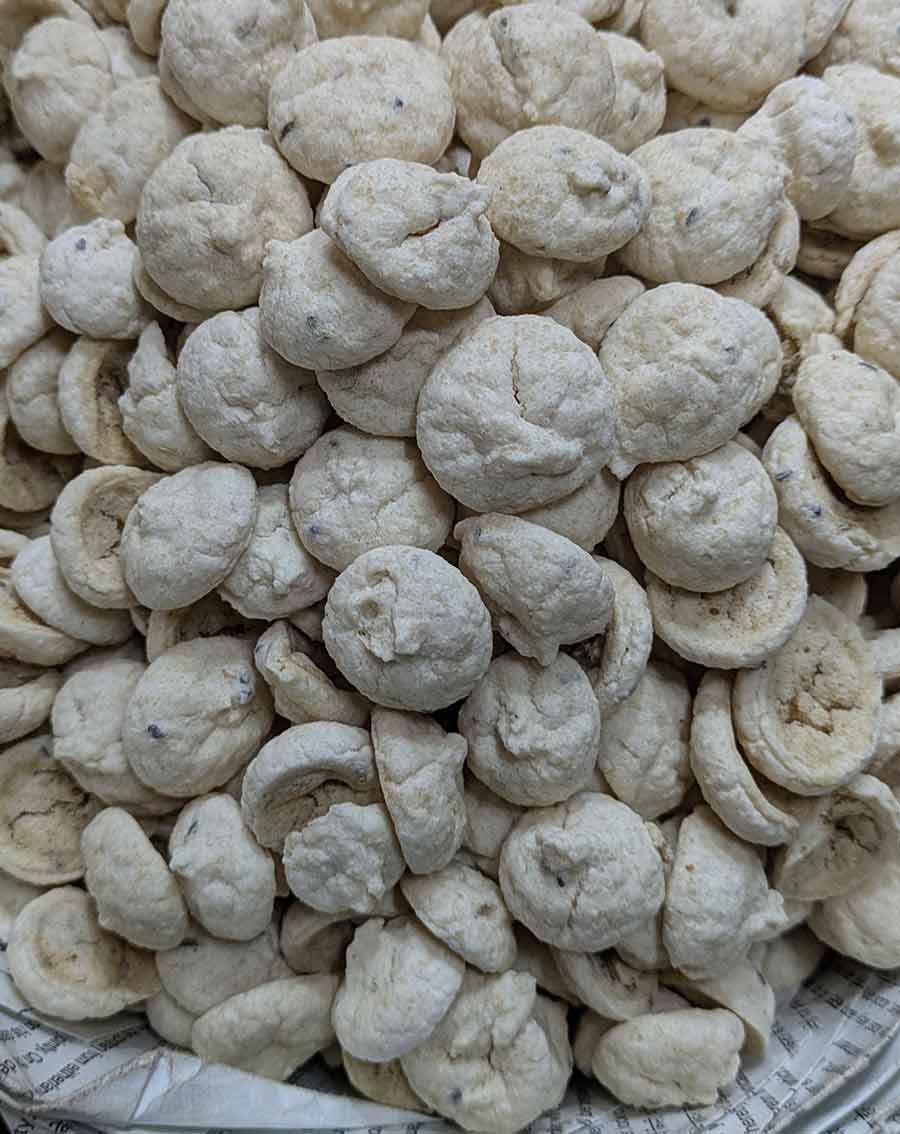 In the artisanal world of bori-making, no variety captures the imagination quite like the Goyna Bori. “It is completely made of Mashkalai Dal, and poppy seeds are used. Because Goyna Bori is so delicate, if we do not put it on the base, it breaks easily.”
