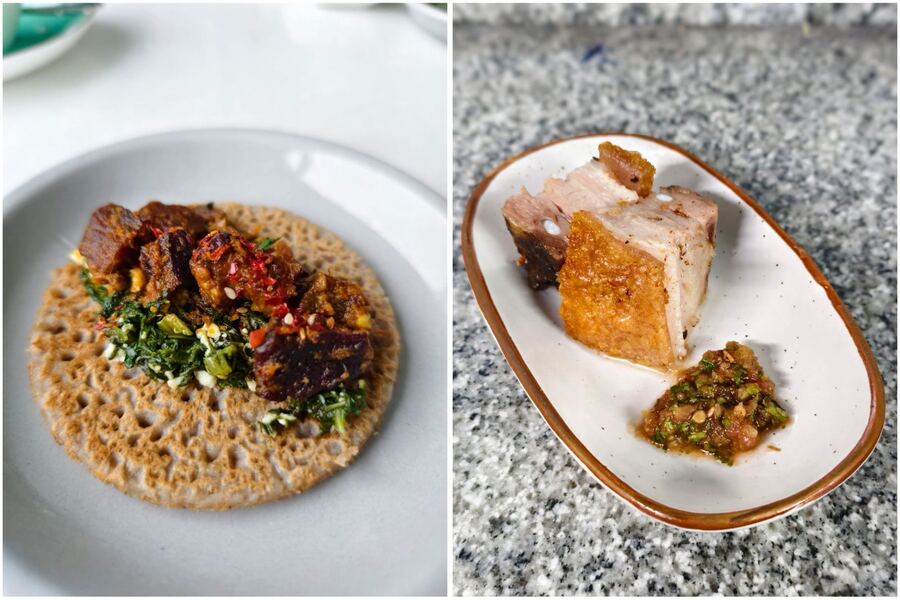Then came the Pahadi Taco by chef Ishita, a simple preparation of soft buckwheat pancakes with smoked mutton and topped with a gundruk dalle salsa and house-made chilli oil. The flavour was a tug-of-war between earthy nuttiness, meaty smoke, and the sour heat of fermented greens and fiery chillies. Chef Katherine’s signature Roast Pork Belly was a standout. Glazed to perfection with a blistered crackling, the pork was soft beneath its crisp armour. The roasted fat, spicy and earthy flavours, and smouldering chilli made the aroma arresting!