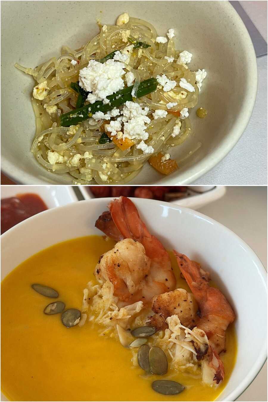 Fing Salad by chef Ishita, up next, offered a light interlude. Glass noodles tangled with monsoon greens, green chillies and seasonal vegetables with Kalimpong cheese, tasted fresh, and ever-so-slightly spicy. Then the chef presented the Mountain Streams soup with its umami-forward broth built on mud crab and prawn. There was a warming flavour of ginger-garlic oil and fragrant jimbu. The nutmeg and timur lent it spice and citrus lift.