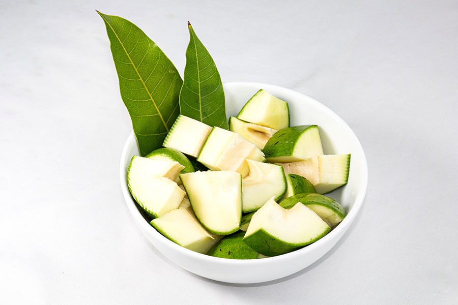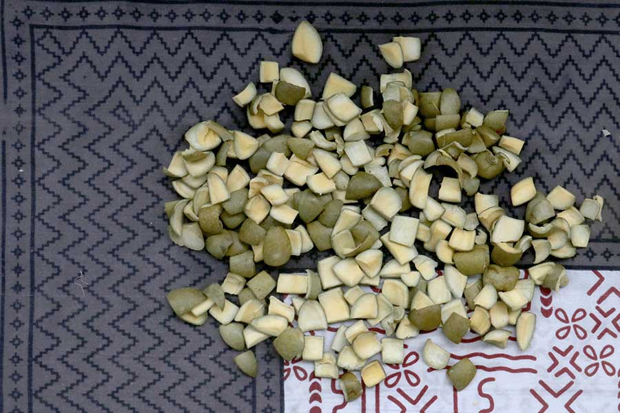 Cut off the stem portion and chop the mangoes into half-inch cubes. If the seed is soft, cut the mango in half, keeping a bit of the hard seed cover intact. The peel and seed casing help the pieces stay firm during pickling. Remove any loose white seed portion. Always use a dry knife or boti for cutting.