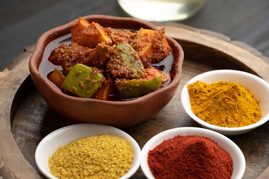 To start with, buying the right kind of mango is crucial. The green mangoes available in Kolkata markets are usually raw Amrapali, Himsagar and Langra. Pick mangoes with a deep green skin and no yellowing. The flesh should be firm to touch. If the ripening process has begun, the pickle will not last long and may turn mushy.