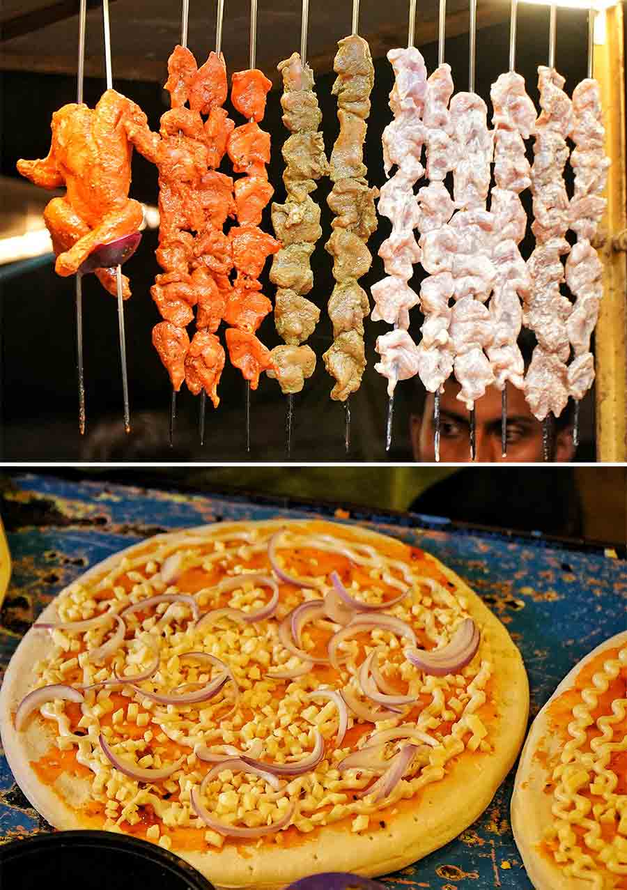 Kebabs on skewers ready to enter the tandoor. Marinated overnight, you can get half a plate of kebabs as little as Rs 80. Not just kebabs, even pizza and burgers are available on this food street.