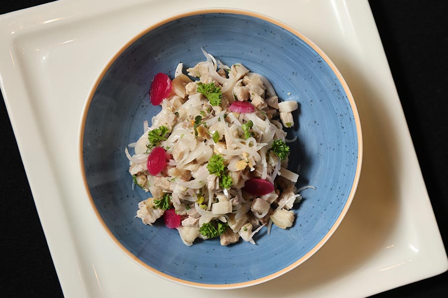 The Dohkhlie, a pork salad, comes with a tangy zing and refreshing crunch. Served cold, it features finely chopped pork tossed with onions, green chillies, and lime, creating a harmony of spice, acid, and fat that cuts through the heavier dishes beautifully.