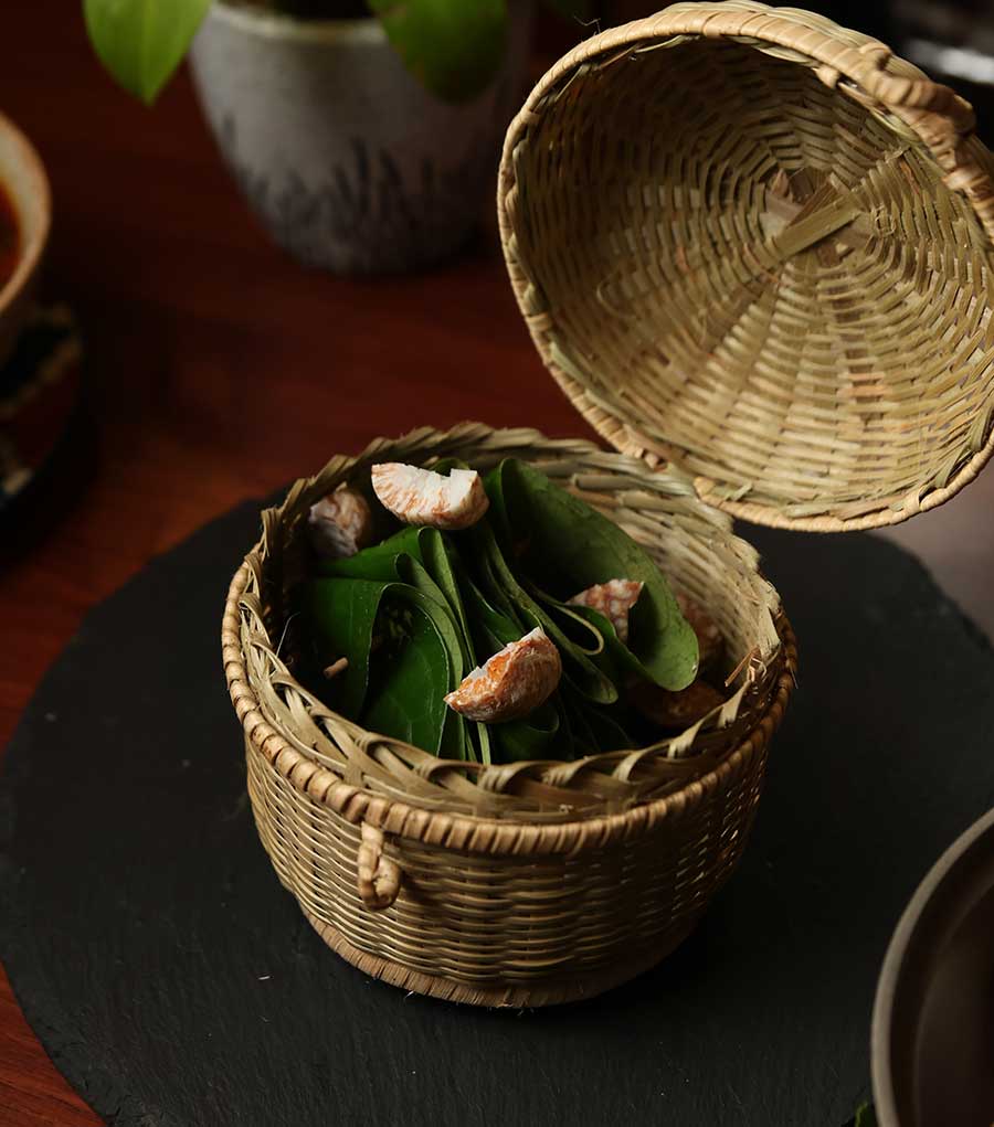 Traditional desserts stay true to the Khasi spirit of minimalism and natural flavour. Sakin Gata, a steamed sticky rice cake layered with coconut, is not overly sweet but incredibly satisfying in texture. It will remind you of Bengal’s pithe. Pineapple slices sprinkled with black salt and chilli flakes offer a punchy, palate-cleansing end to the meal. And finally, every meal concludes with Kwai, betel nut wrapped in a paan leaf, symbolising hospitality and respect in Khasi culture.