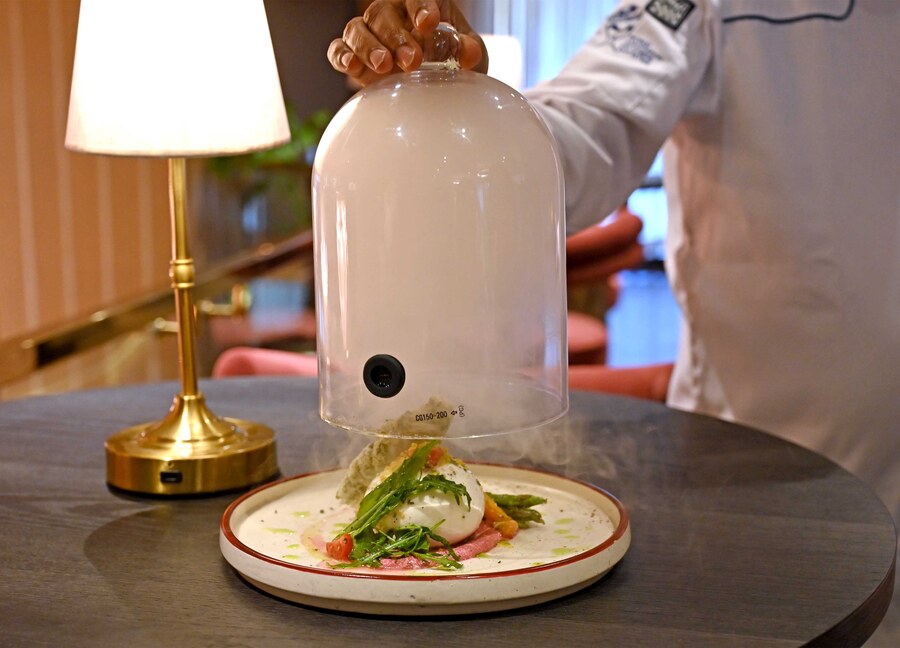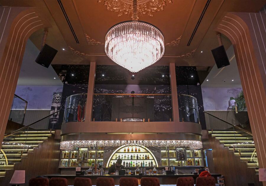 La Soiree is a 100-seater dining space that boasts French-inspired interiors with shades of maroon, brown and white. High ceilings with statement lights and chandeliers add drama, while plush couches, soft carpets and patterned wallpapers create a cosy ambience.