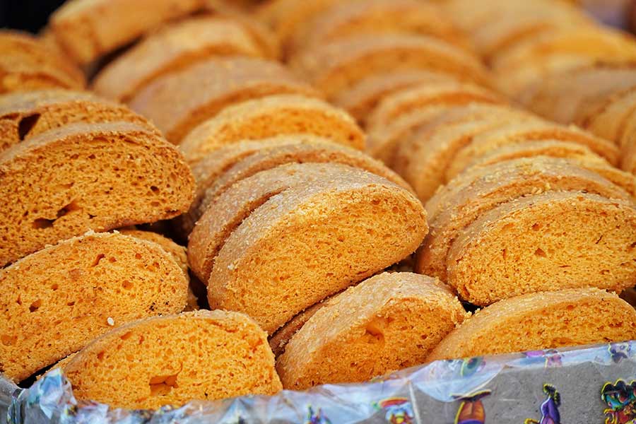 Long before dry cakes hit the market, these sweet toast biscuits were sold by the kilo at the stalls. The humble toast biscuit, or simply “toast” as it is called across Kolkata, is sliced from sweetened bread and baked again until dry and crisp. It wears a light orange-gold hue and pairs well with milk tea.