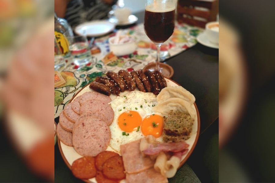 Maharaja Darjeeling Pork Platter at Cup Ebong is a hearty, indulgent spread celebrating pork in all its glory. Two perfectly sunny-side-up eggs anchor the plate, joined by juicy cocktail sausages, pork salami, ham, crisp bacon and comforting meatloaf, creating a satisfying, all-day feast for brunch lovers and serious carnivores.