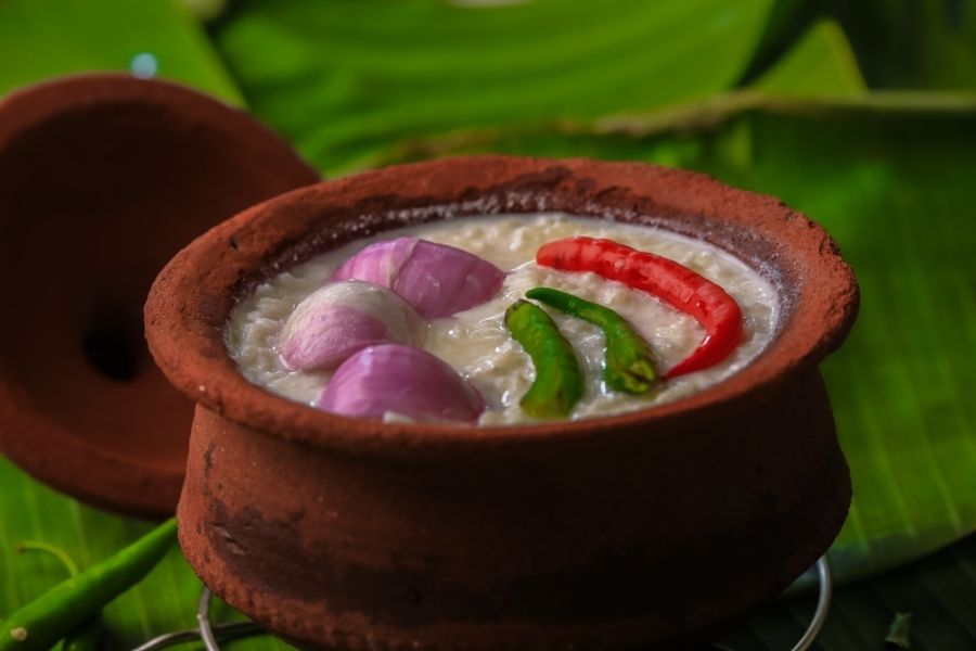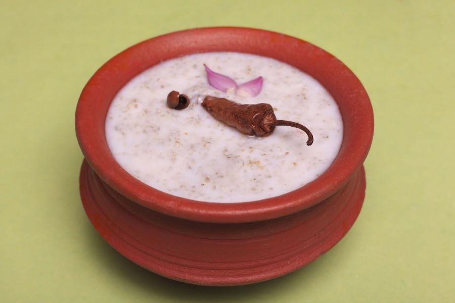 When Panta Bhaat crosses the border and reaches Odisha, it is known as Pakhala. Pakhala is traditionally fermented overnight with water and curd. Spiced with cumin and dry chillies, it is served with raw onions, chillies, fritters and fried veggies. Check out the recipe here.