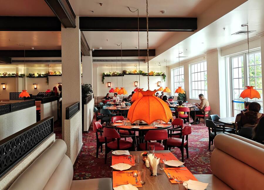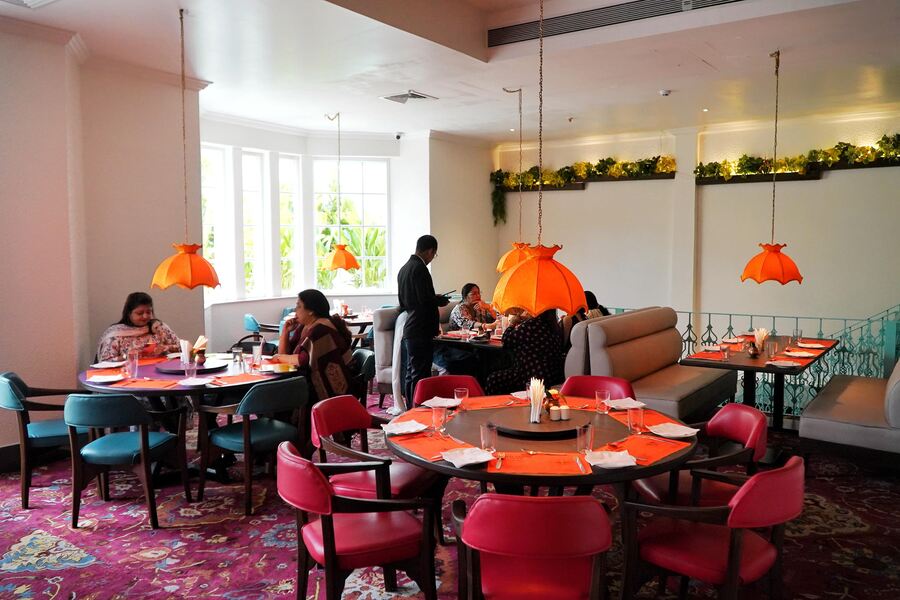 The interiors in the new space mirror the restaurant’s familiar look — orange hanging lamps, textured white walls, carpets and uniformed staff — elements that regulars associate with the Peter Cat experience.