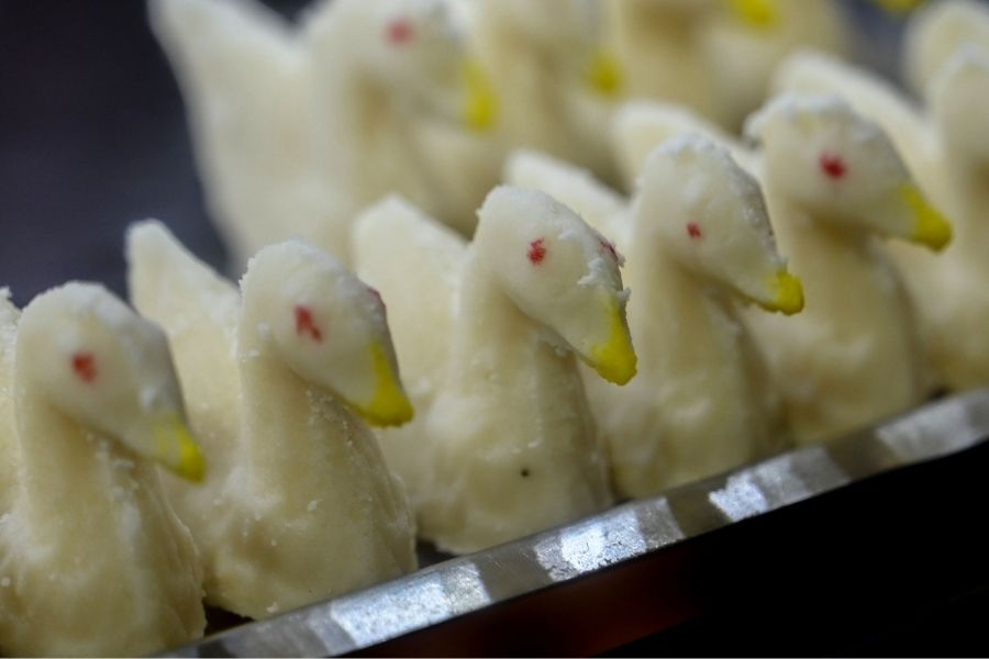 Next was the hansh mishti, a duck-shaped sandesh that turned every bite into playtime. Most children, being children, would start by biting off the head. Made in the ‘koda pak’ style (the mixture is cooked longer for a firmer texture), the hansh mishti had a delightful softness within. It is still available at iconic sweet shops like Putiram.