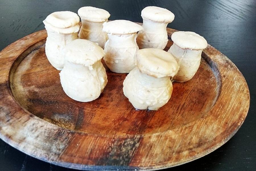 Come winter, Gur Kolosh takes over sweet trays. This sandesh, shaped like a tiny earthen pitcher, is filled with runny nolen gur, the liquid gold of the season. It is firm outside with liquid nolen gur inside.