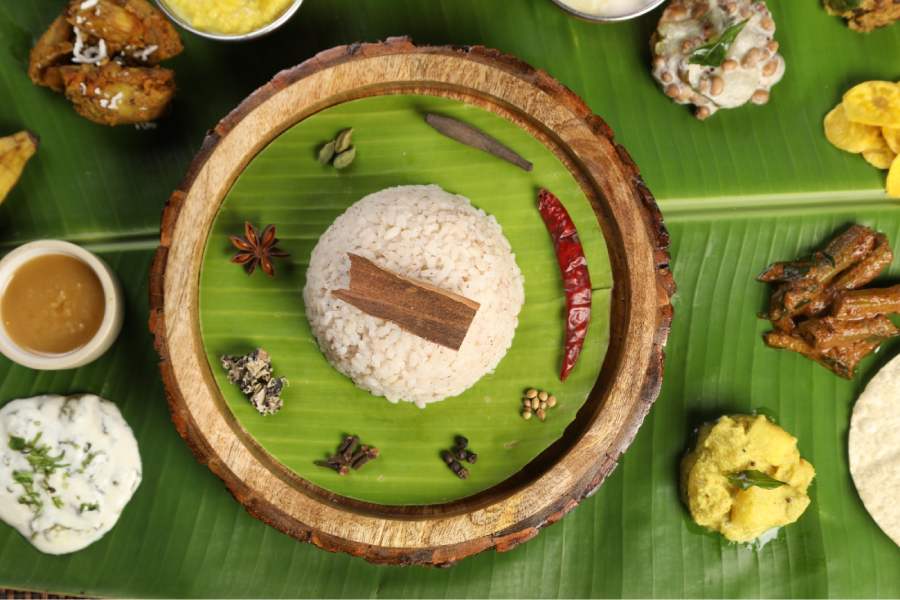 The non-vegetarian Sadhya includes all of the above, plus Malabar Chicken, Mutton Coconut Fry, Meen Mappas and Konju Olarthiyadhu.