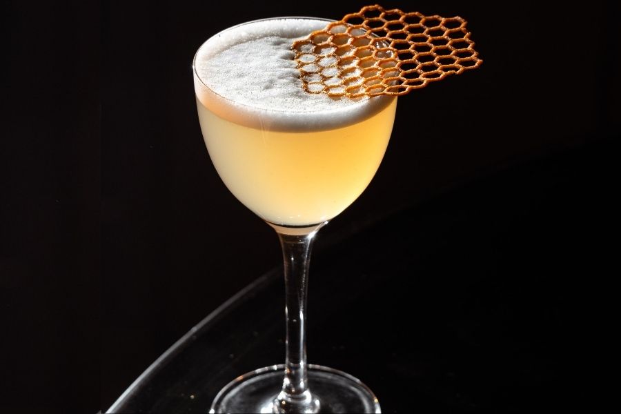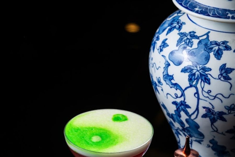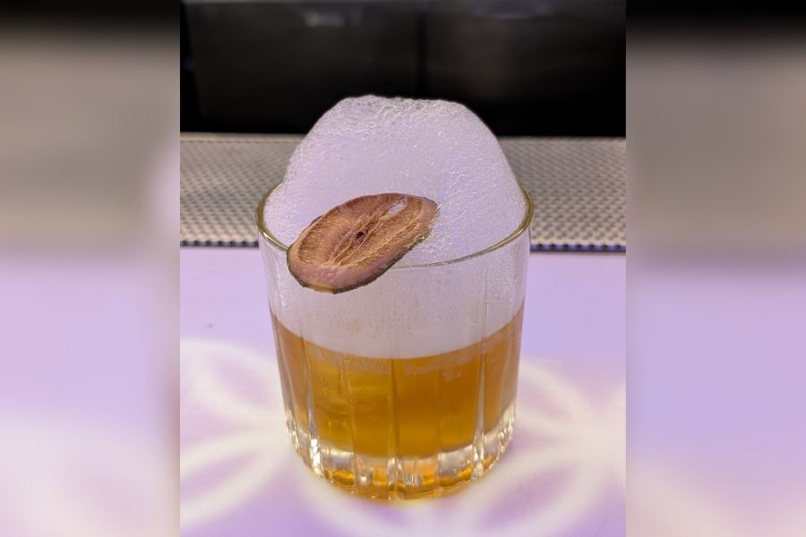 This enticing green-and-white frothy drink from Lucky Tigerr is called Yin and Yang. Priced at Rs 795, the drink is made with gin, blue pea, yuzu, peach blossom tea syrup and egg whites.