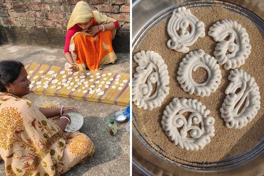 Bori is a quintessentially Bengali ingredient. The sun-dried lentil parcels are fried and used in a variety of preparations from stir fries to curries. One of the bori-making traditions of Bengal is the making of goyna bori which are shaped to look like jewellery (goyna or gohona). Their unique, artistic shapes give them an edge over the regular boris