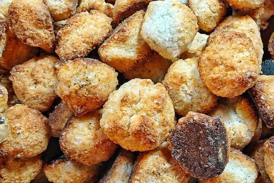 These are not the typical ‘projapoti’ biscuits sold at Kolkata’s tea stalls. Instead, they resemble a cross between projapoti biscuits and Little Hearts — smaller, flaky, and just subtly sweet. Their light crunch makes them the kind of snack you finish before you realise it.