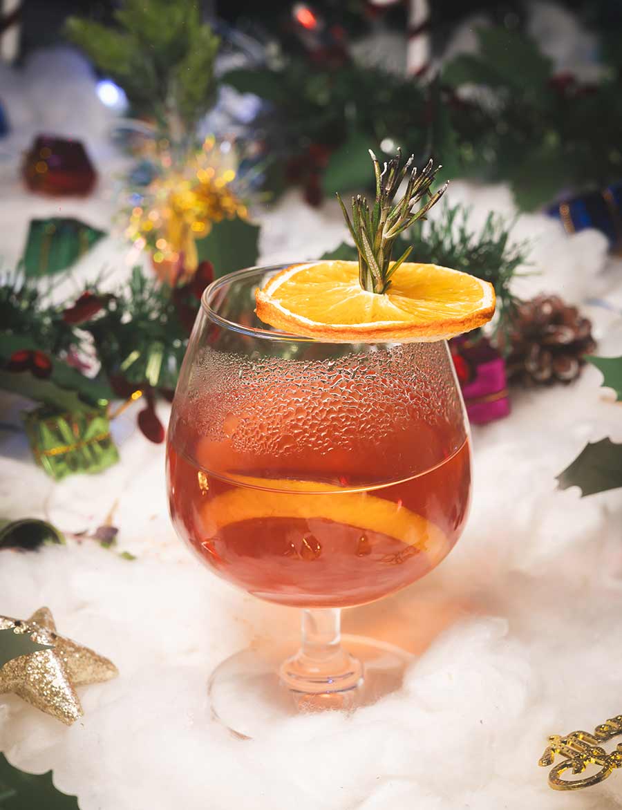 Inspired by Shantiniketan’s artistry, this cocoa nib–infused red wine is blended with nolen gur, star anise, clove and hints of orange peel. Finished with a cocoa-dusted orange wheel, it’s a soulful Bengal-inspired winter pour.