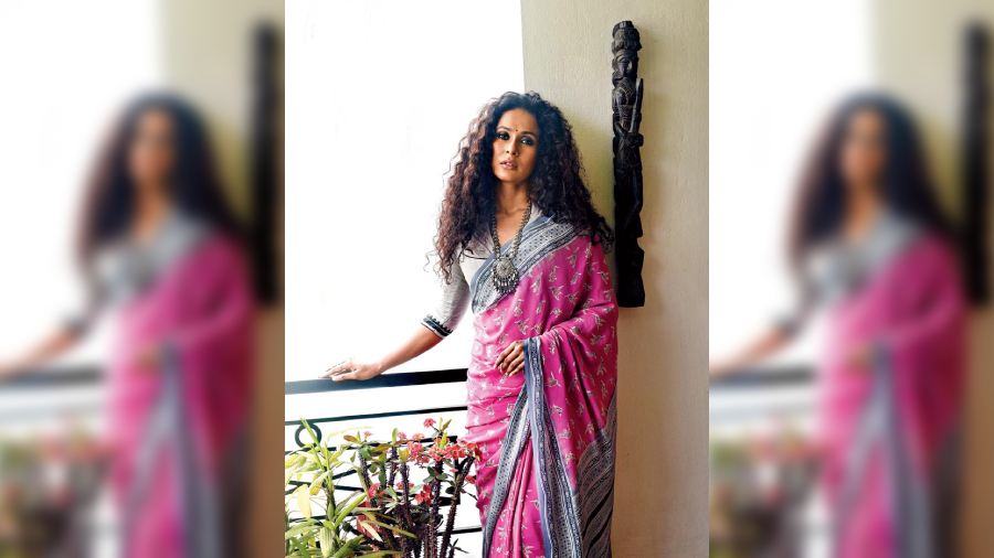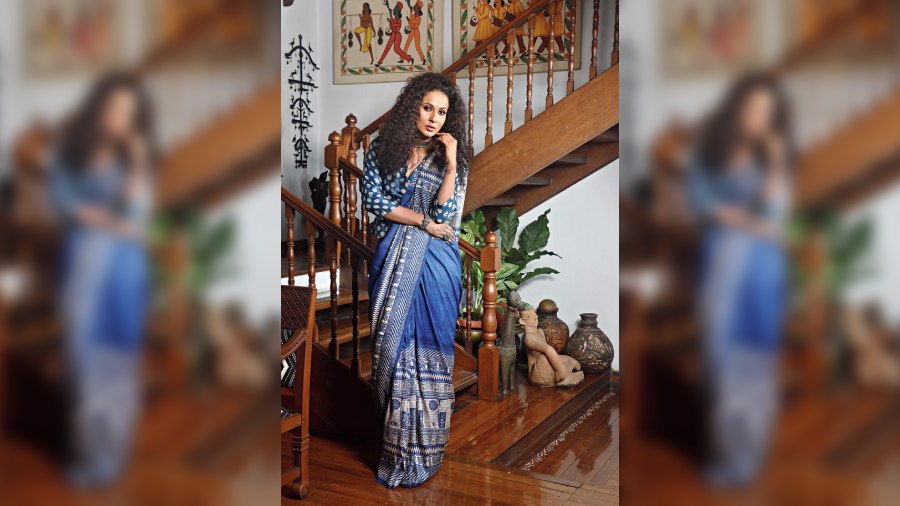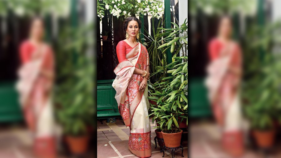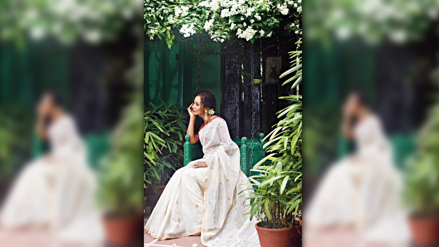 The serenity of this lovely frame is the hero. Ushoshi draped a traditional Chanderi with an ajrakh-print blouse from Aranya Kolkata. The gold jewellery from Anjali Jewellers perfectly matches the mood of the sari. The flowers accentuate the classic-calm vibe. “I try to retain the heritage of a particular craft and mix and match with my sensibilities,” says Nandita.