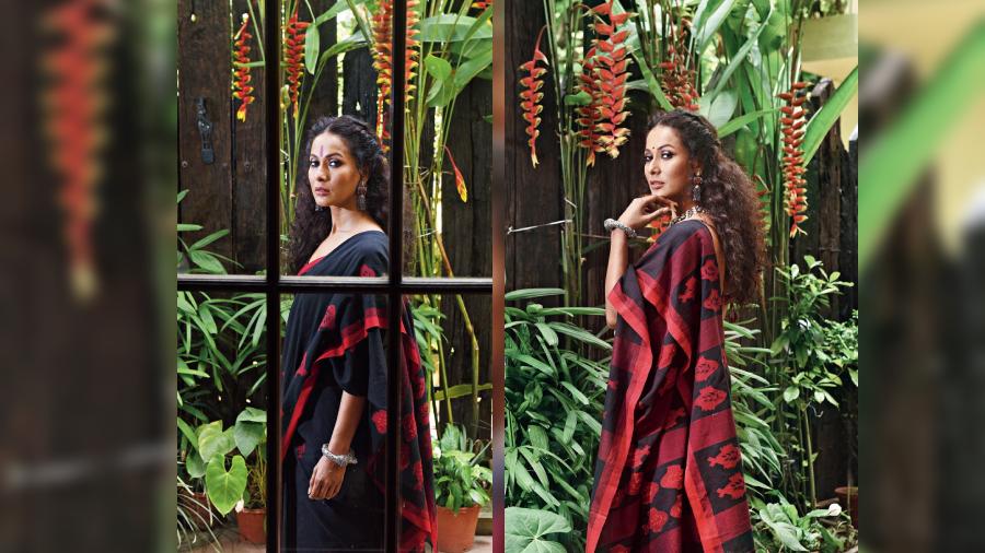 The all-time favourite red-and-black combination plays out in this Phulia cotton drape, with the fish motif being the centrepiece. An ajrakh-print strappy blouse is complemented by statement silver jewellery, all from Aranya Kolkata, to create a boardroom-to-bar look. A touch of braid and metallic eyes give it a hint of dressy. If you want a bit of drama, smudge your bindi, Nandita style, like we have tried!