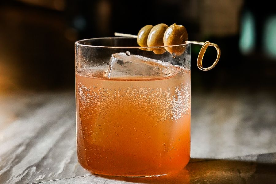 Brine & Bloom (Rs 395): Inspired by the Sour Patch Martini, this cocktail features maraschino cherry brine, olive brine and an in-house citrus cordial. Finished with the classic three olives garnish, it’s a favourite among artists who perform at the bar’s Legends sessions.