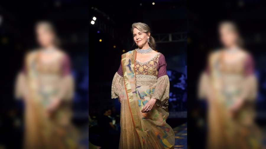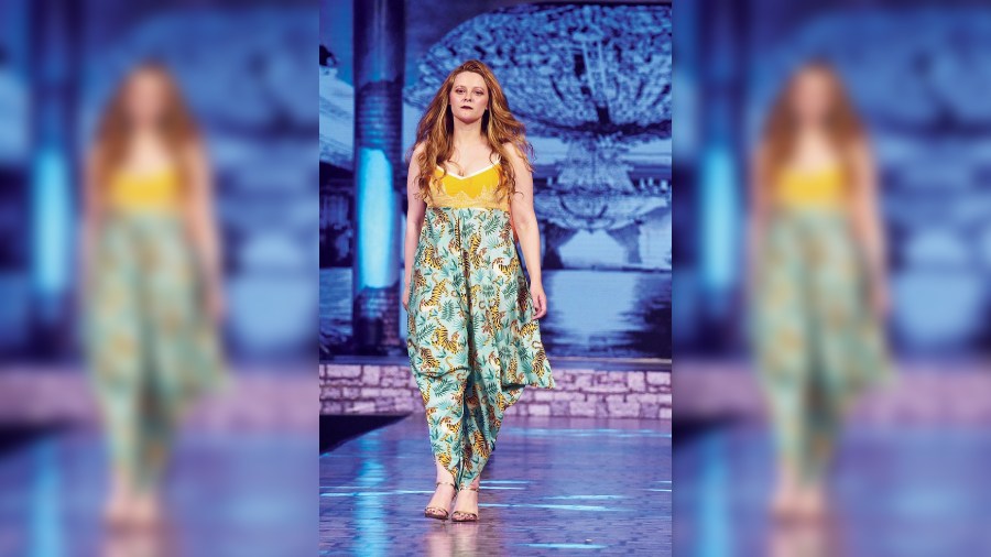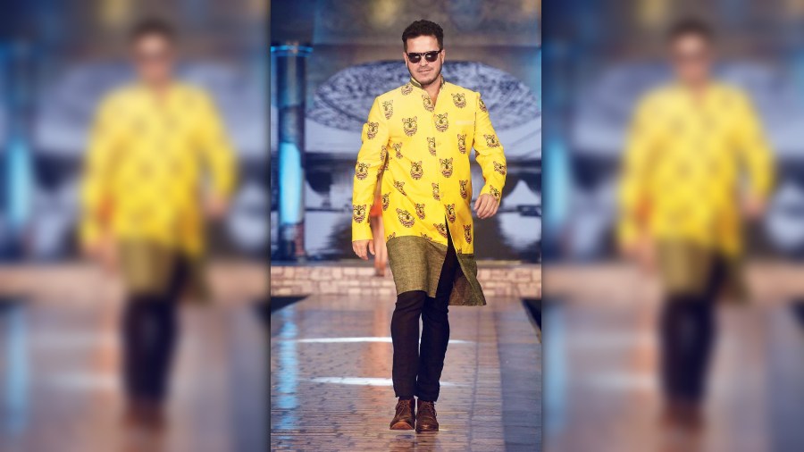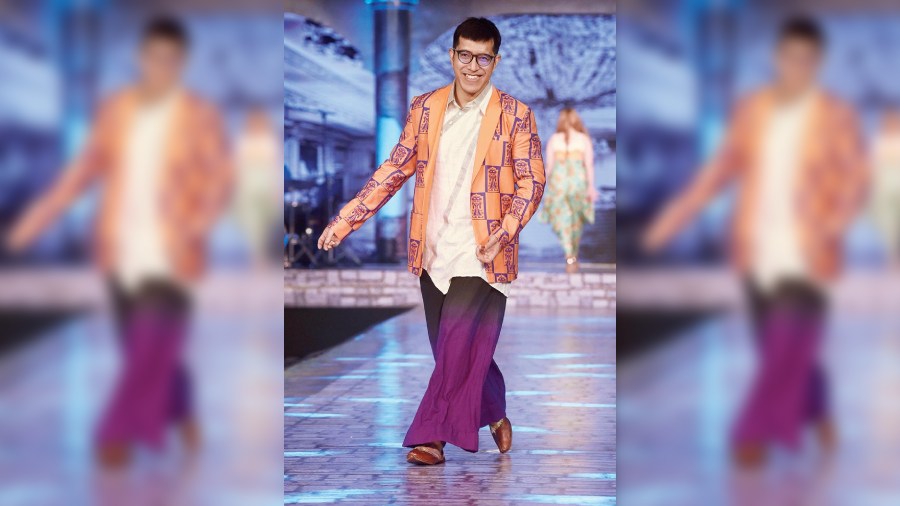 Nutt Svasti-Salee, consul at Thai consulate general in Calcutta, kept the mood fun on the ramp in a summer jacket with Bhooter Raja print (inspired from Satyajit Ray’s movie Goopy Gyne Bagha Byne) styled with an asymmetrical linen shirt and the trending wide-legged trousers.