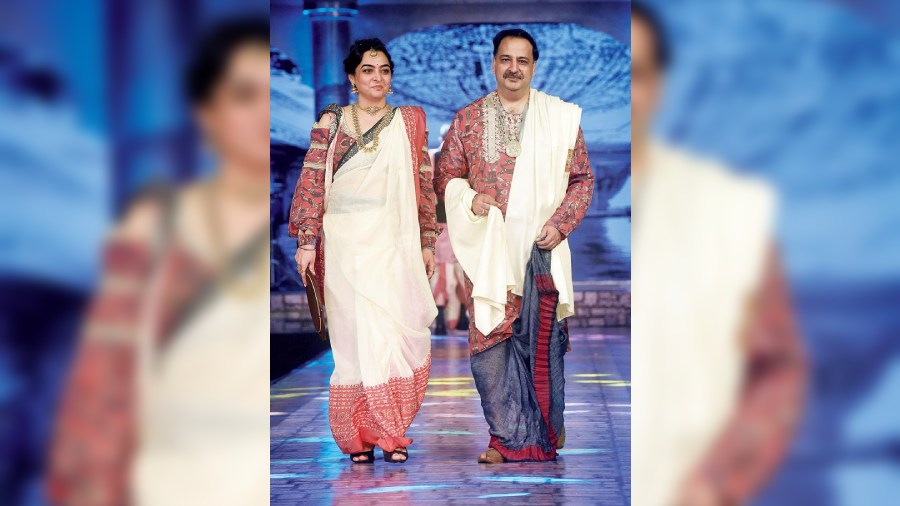 Vendula Knopfova from Russia walked in Bengal’s classic red-and-white Dhakai jamdani sari, paired with a stylish ruffled lace blouse, along with Simon Kleinpass from the German consulate in Calcutta, sporting a linen embroidered bandhgala teamed with a matching dhoti.
