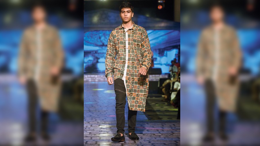 Representing the style sensibilities of today’s youth, Aaryansh Dutta walked the ramp in a Bangali typography-printed linen asymmetrical kurta from the Neo-Bengali collection, paired with a denim pants.