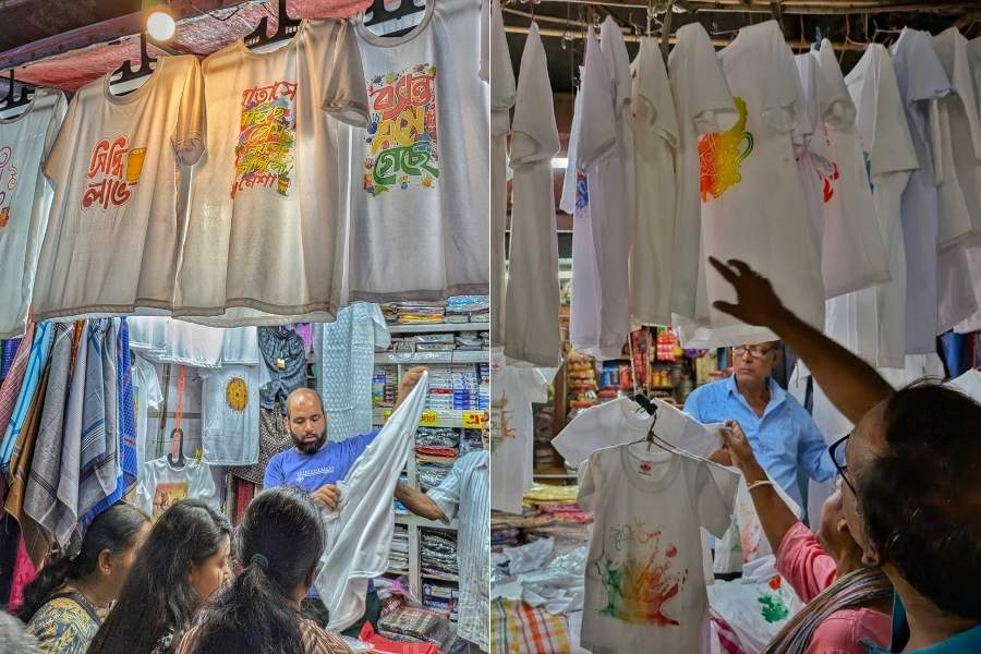 A pristine, white t-shirt is mandatory gear on Holi. Baguiati market has stocked up on a variety of them.