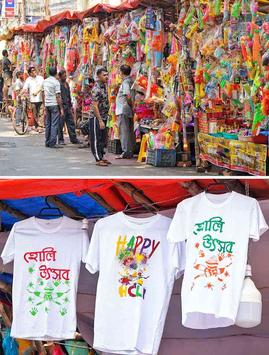 White t-shirts are also available in Gariahat. So, if you are in south Kolkata, you can just get your hands on them from various stalls lining the main street. The Holi market here also has colourful wigs.