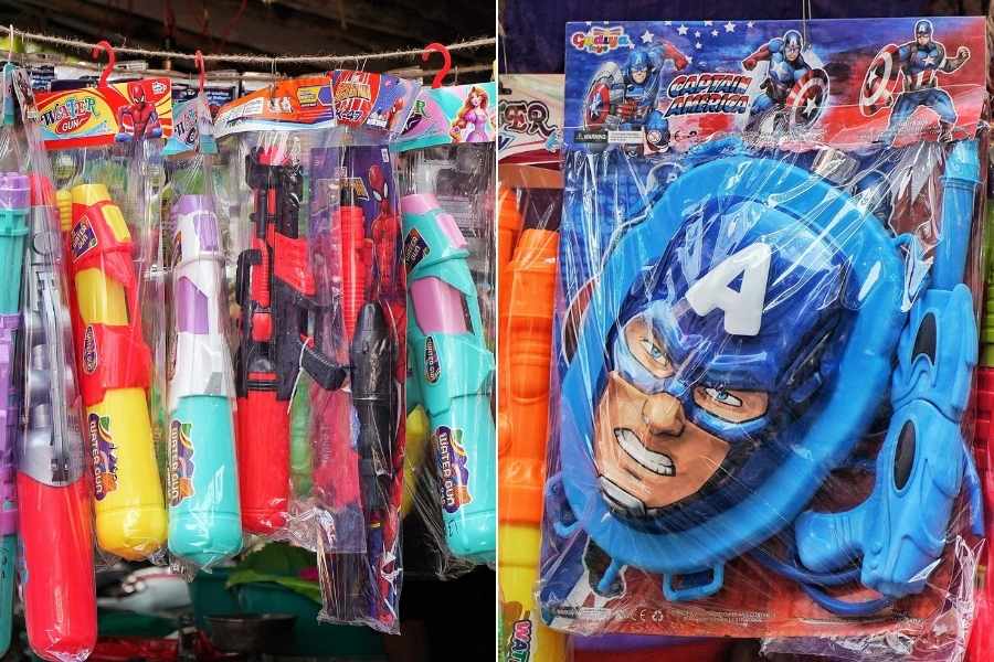 These are some of the cool pichkiris you can find at Lake Market in various sizes. The coolest of this lot has to be the Captain America shield and water gun.
